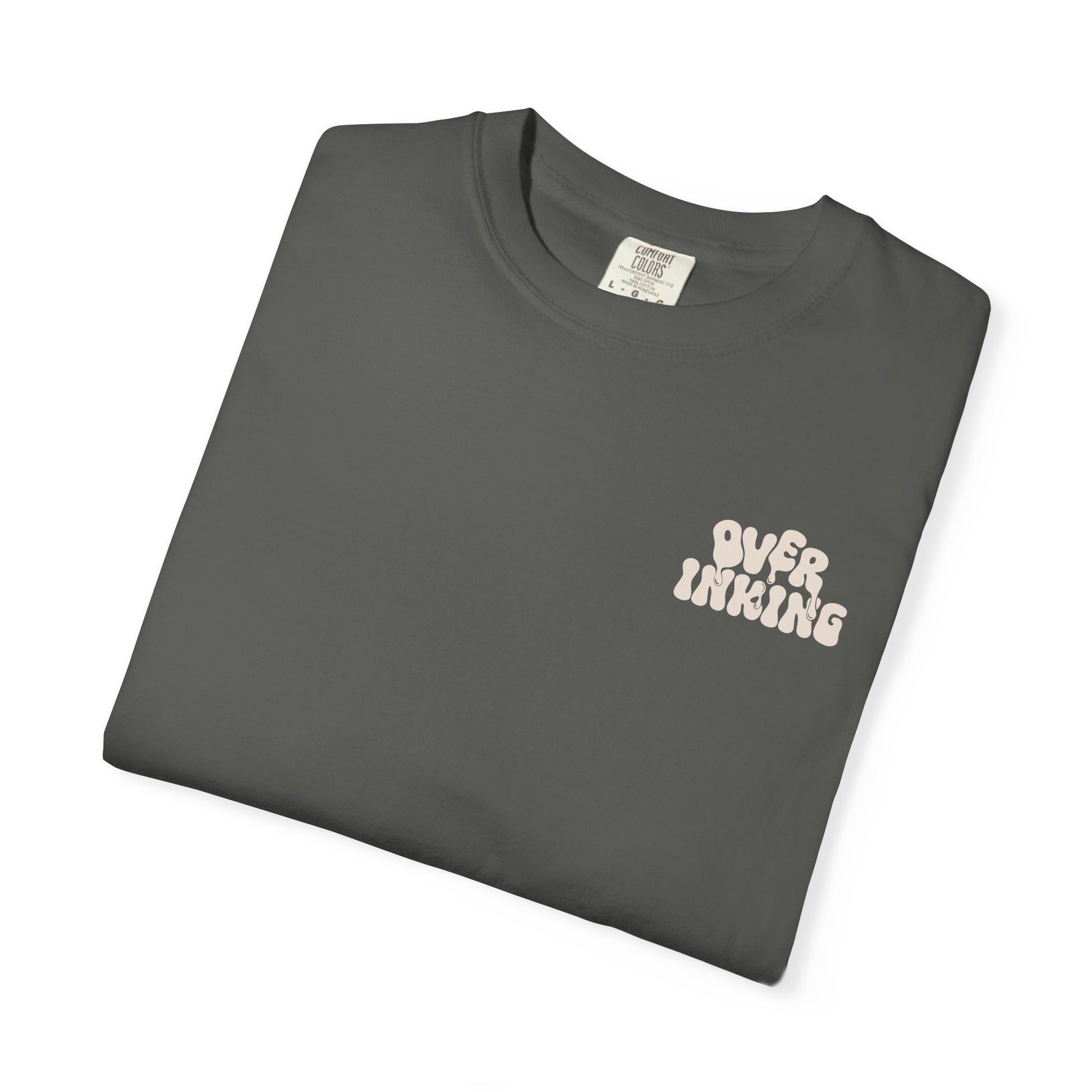 A heavy, garment-dyed tee with a laid-back, slightly weathered look — soft to the touch and built to last. Front chest shows a small, hand-drawn logo; the back features a moody, inked illustration of an overwatered plant with a sleepy, owl-like face. The muted dye and relaxed fit give this shirt the feel of a lived-in favorite that layers easily under jackets or shines on its own. Wear it when you want effortless comfort with a little offbeat character — great for slow mornings, plant-care sessions, or nights around the firepit.
